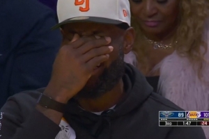 GIF-克莱伯上篮被篮筐帽了 詹姆斯在场边捂脸笑不停
