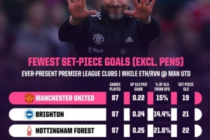 滕哈赫共率曼联踢了87场英超比赛,通过定位球打进19球,平均每场0.22球,定位球进球占球队总进球数仅为15%。本赛季,曼联13轮英超比赛已经通过定位球打进10球,和踢了14轮的阿森纳持平。曼联本赛季场均可通过定位球打进0.77球,定位球进球数占球队总进球数的47.6%。