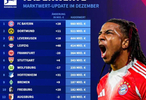 拜仁慕尼黑以9.8亿欧高居榜首,多特蒙德以5.11亿排名第二,勒沃库森和莱比锡分别以4.44亿和4.14亿欧排名三四。