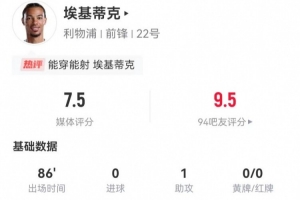 体育资讯12月28日讯 利物浦在本轮英超对阵狼队,埃基蒂克本场数据如下: