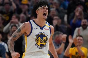 库里三分不中,桑托斯抢到前场篮板并且救球成功!