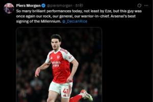 “今天有许多精彩的表现,尤其是埃泽,但这位球员(赖斯)再次成为我们的后盾、将军和带队战士。阿森纳在千禧年最好的一笔引援!”